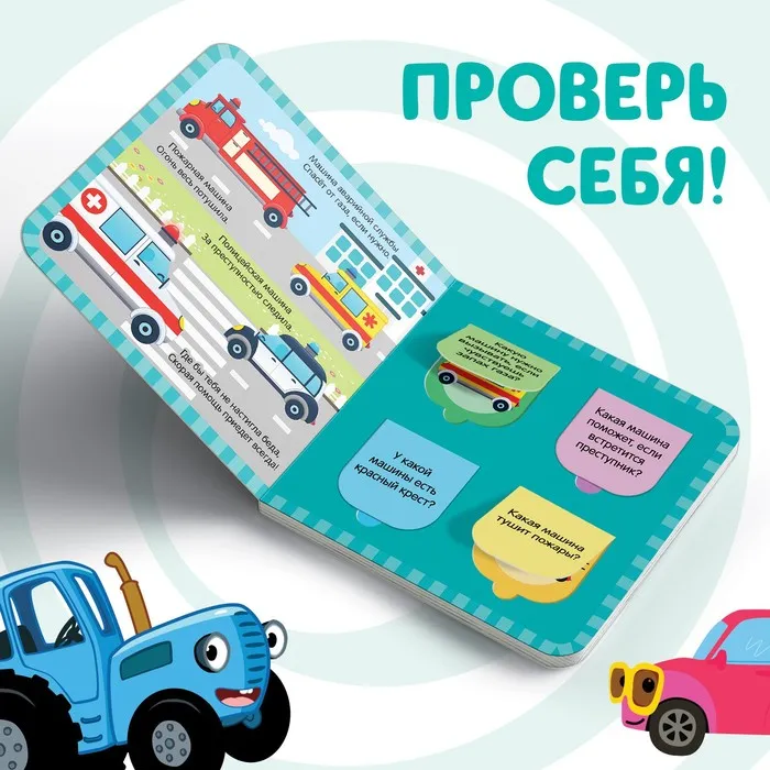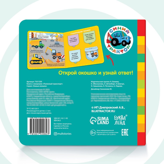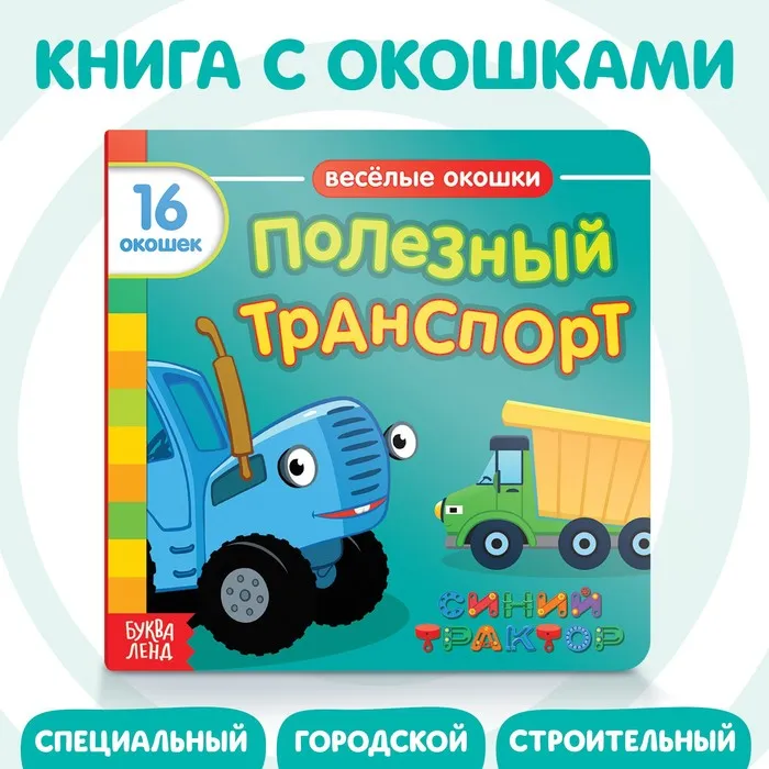 Картонная книга с окошками «Полезный транспорт», 10 стр., 16 окошек, Синий трактор — Характеристики