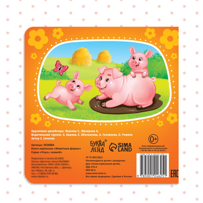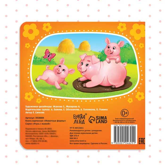 Книга для малышей «Животные фермы» формата квадрат с твёрдым переплётом станет первым шагом в мир животных. Эти 10 страниц из плотного картона, познакомят ребёнка с обитателями фермы через яркие картинки и весёлые стихи.
