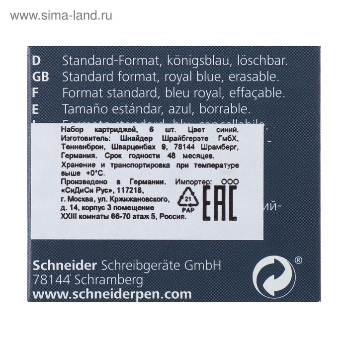 Картридж для перьевой ручки Schneider, 6 штук, кобальтовый, синий, картонная коробка — Характеристики