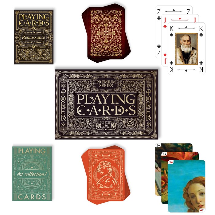 Перед вами премиальный подарочный набор, который включает в себя колоду карт с иллюстрациями в стиле эпохи Ренессанса, а также колоду карт с произведением Сандро Боттичелли «Рождение Венеры». Прелесть второй колоды в том, что её можно сложить как пазл и получить цельную картину.