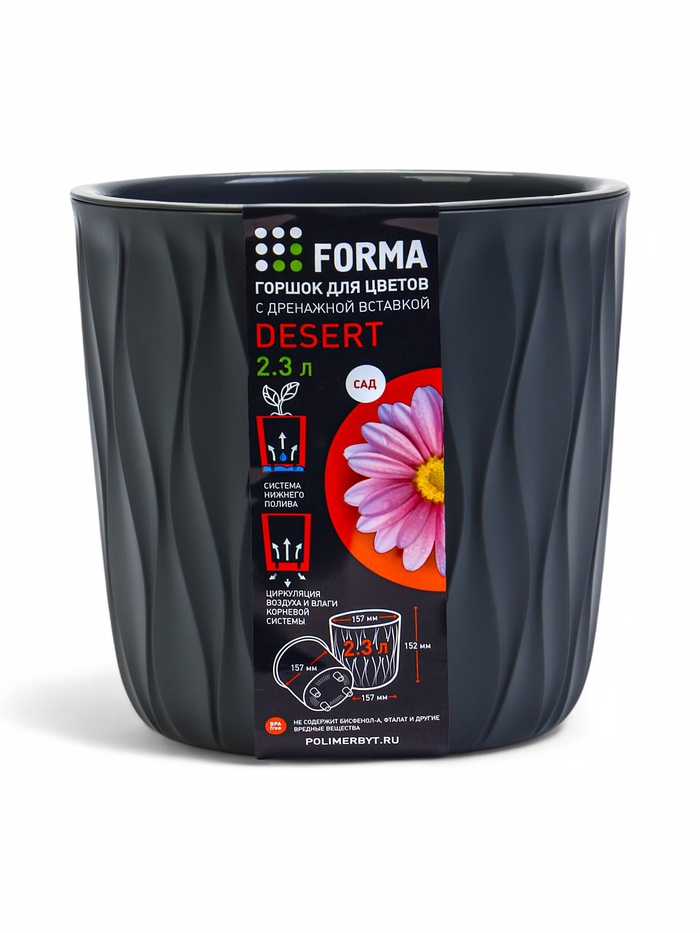 Кашпо для цветов Desert, 2.3 л, d=15.7 см, h=15.2 см, пластиковое, со вставкой, серое — Характеристики