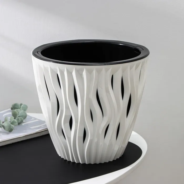 - Пластик с глянцевой поверхностью: материал подчёркивает насыщенность цветов. Кашпо сохраняет яркость рисунка при регулярном уходе.