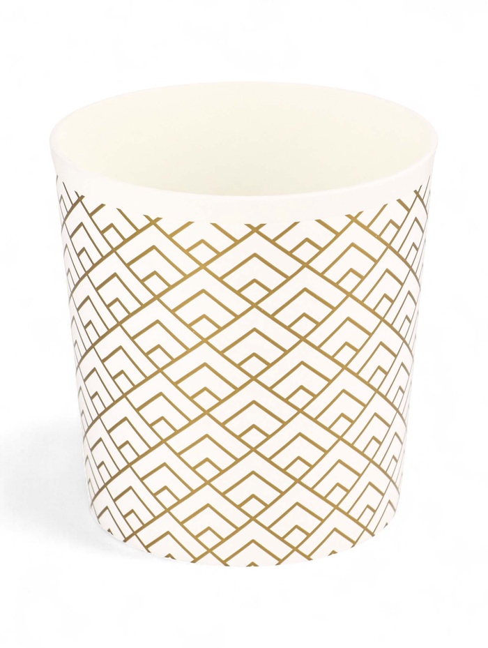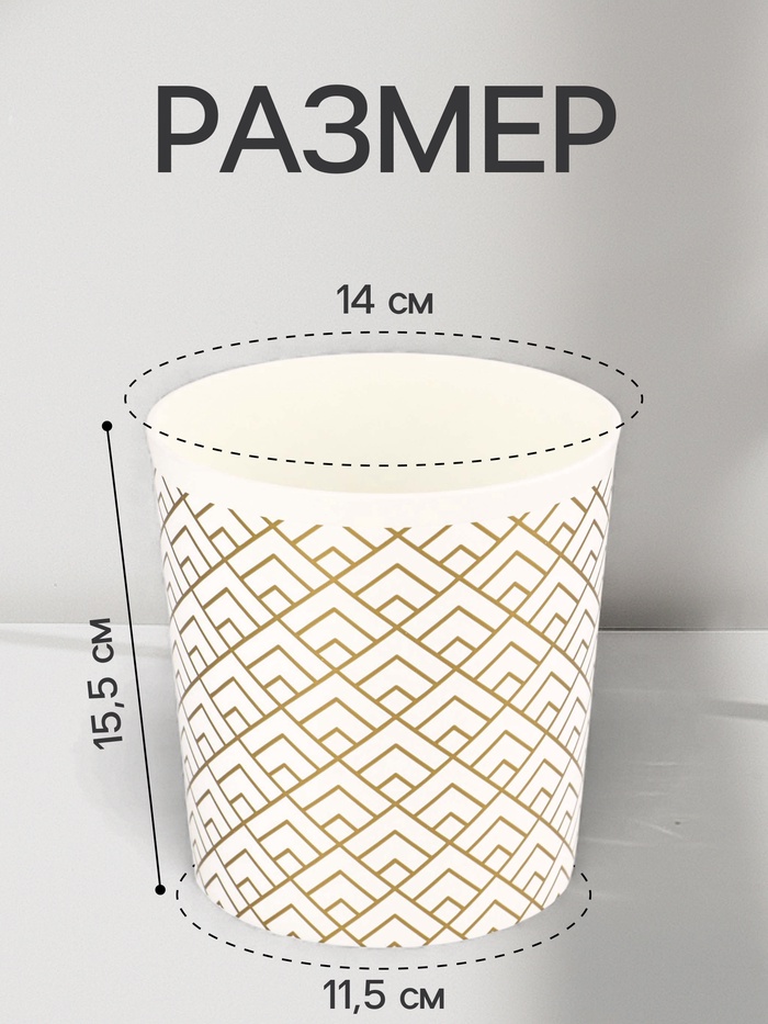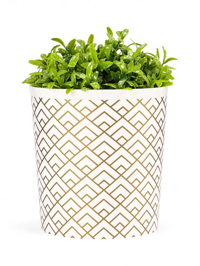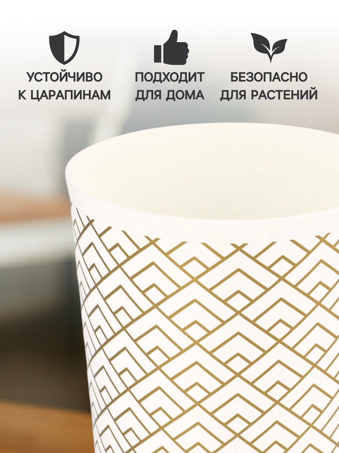 - Лаконичный дизайн: Кашпо выполнено в классическом белом цвете с золотистым рисунком. Этот дуэт создаёт нарядный внешний вид, который легко впишется в современный интерьер, будь то гостиная, кухня или офис.