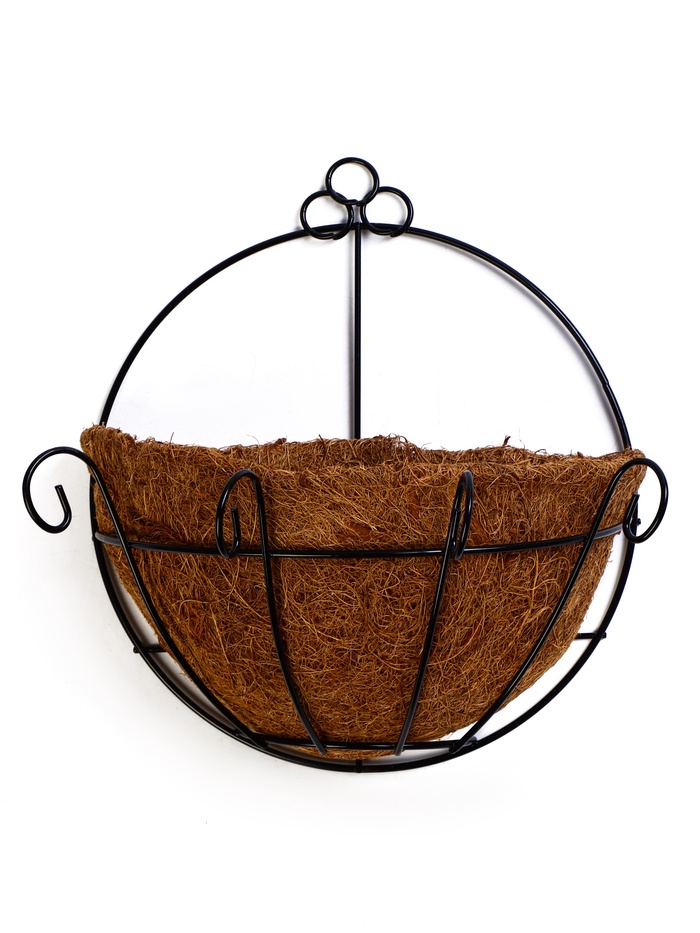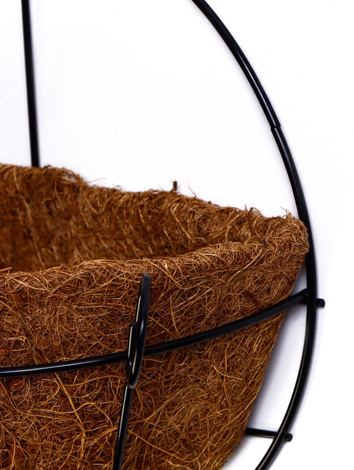 Эстетика и функциональность: строгий металлический контур сочетается с фактурой натурального кокоса. Такое кашпо подчеркивает красоту растения, не отвлекая на себя внимание. Закрытое дно защищает поверхность стены от влаги после полива.