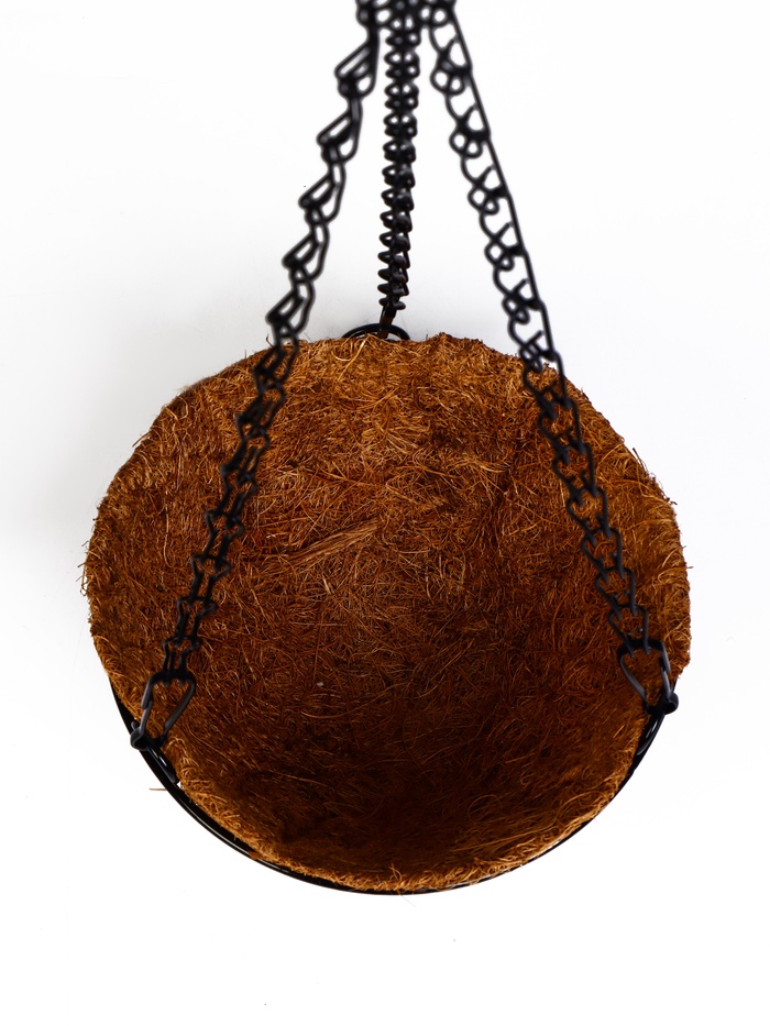 Эргономика и экологичность: полусферическая форма экономит пространство и обеспечивает равномерный рост корней. Натуральное кокосовое волокно со временем разлагается, не нанося вреда окружающей среде. Решение особенно удобно для компактных помещений — кашпо размещают у окон, на лоджиях или в зимних садах. Металлическое покрытие защищено от коррозии при умеренной влажности.