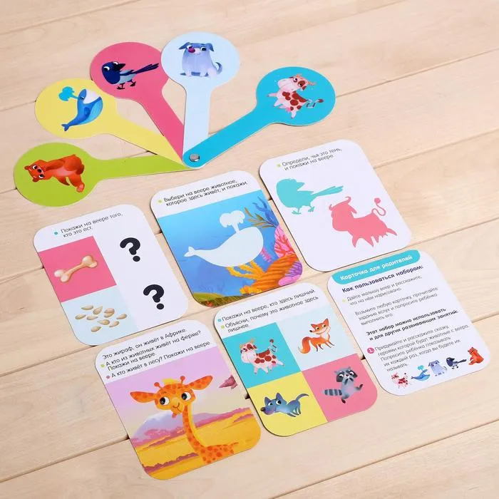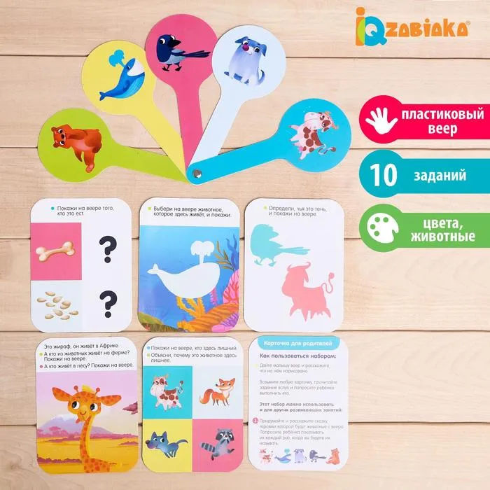 Умный веер «Животные» — это уникальный развивающий набор, который обучит вашего малыша разным видам зверей: домашним, лесным, морским. Ребёнок узнает, чем питаются животные и где обитают. Научится объединять предметы по признакам, находить сходства и различия и мыслить логически!