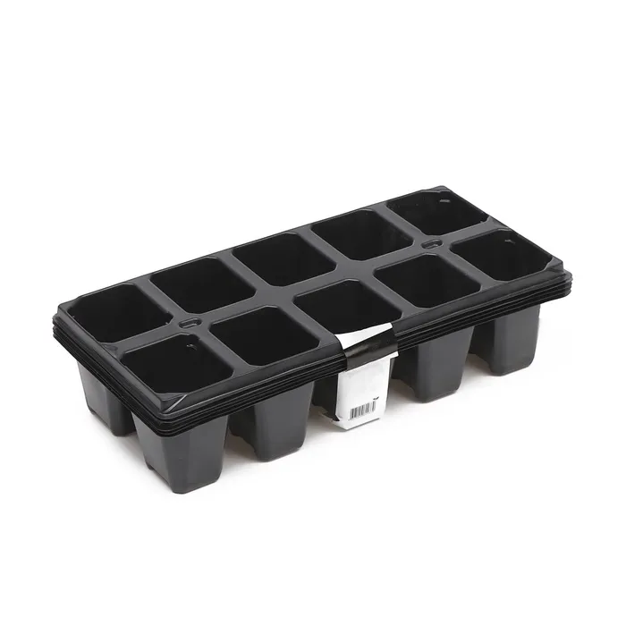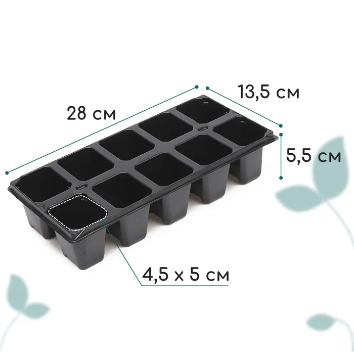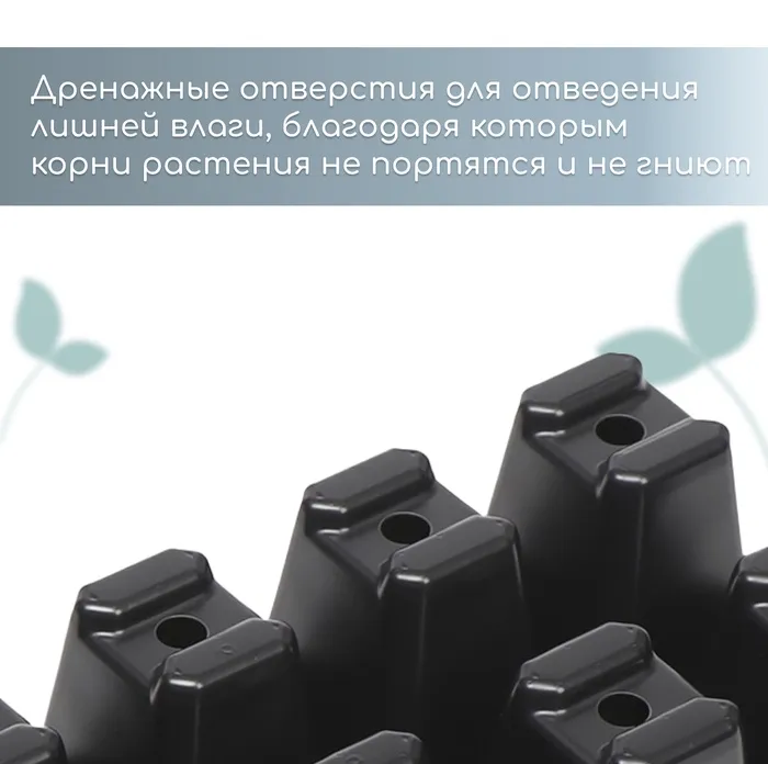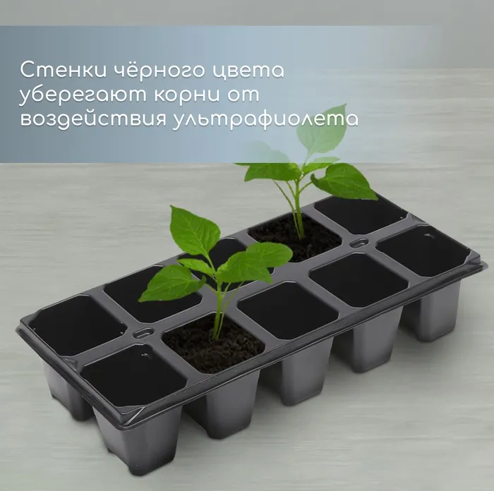 В каждой ячейке корневая система развивается свободно. Поддон регулирует увлажнённость почвы. При недостатке полива добавьте в него воду для впитывания. При избыточном орошении сливайте жидкость из поддона. Пластиковая кассета легко моется, сохраняет форму на солнце, не гниёт.