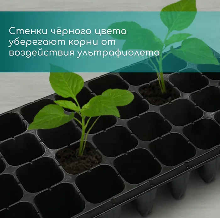 В каждой ячейке корневая система развивается свободно. Поддон регулирует увлажнённость почвы. При недостатке полива добавьте в него воду для впитывания. При избыточном орошении сливайте жидкость из поддона. Пластиковая кассета легко моется, сохраняет форму на солнце, не гниёт.