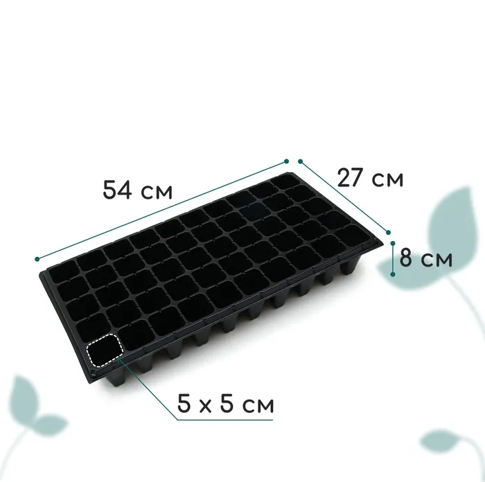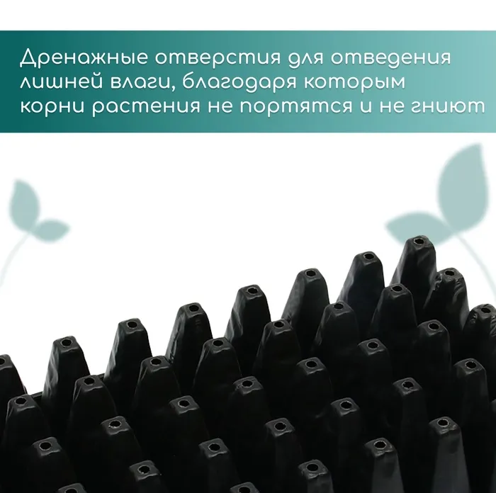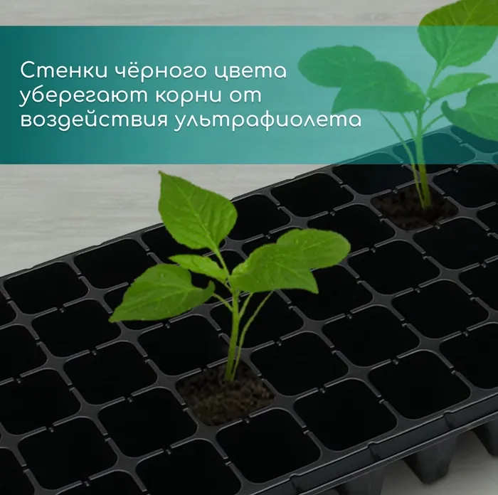 В каждой ячейке корневая система развивается свободно. Поддон регулирует увлажнённость почвы. При недостатке полива добавьте в него воду для впитывания. При избыточном орошении сливайте жидкость из поддона. Пластиковая кассета легко моется, сохраняет форму на солнце, не гниёт.