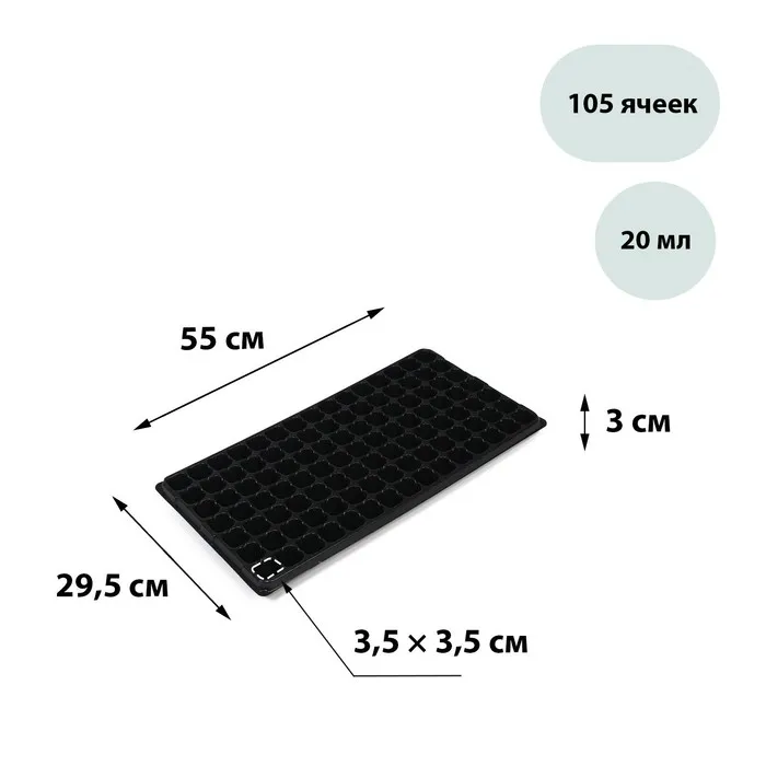 В каждой ячейке корневая система развивается свободно. Поддон регулирует увлажнённость почвы. При недостатке полива добавьте в него воду для впитывания. При избыточном орошении сливайте жидкость из поддона. Пластиковая кассета легко моется, сохраняет форму на солнце, не гниёт.