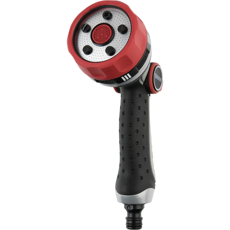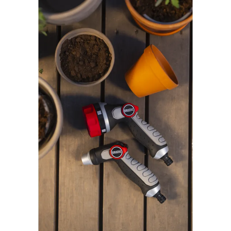 Многофункциональный пистолет для полива Brücke делает полив сада простым и удобным. Пистолет имеет разнообразные настройки: можно выбрать один из 5 различных режимов распыления – от точечного до мелкого тумана, а сила потока регулируется удобно большим пальцем.