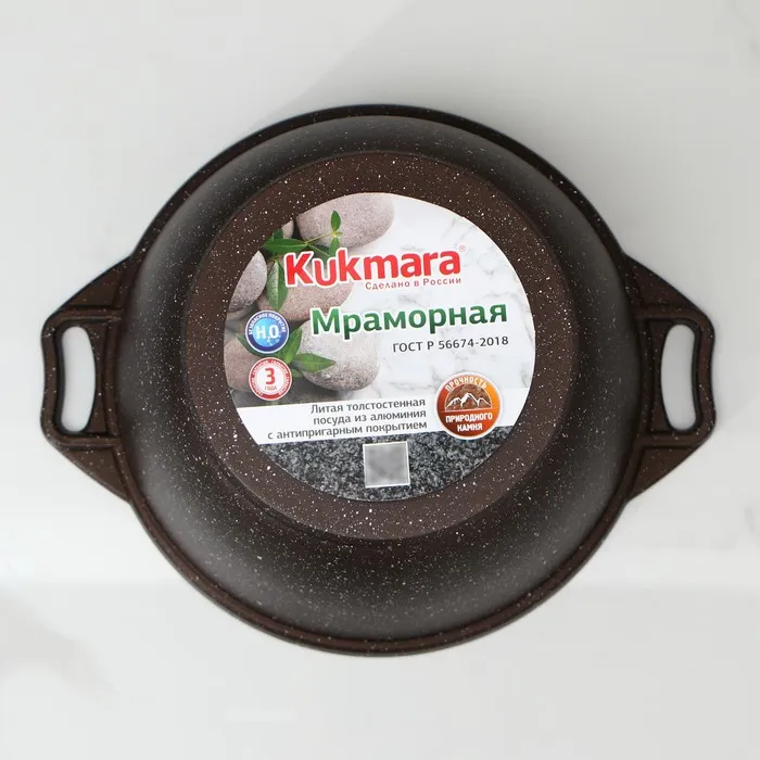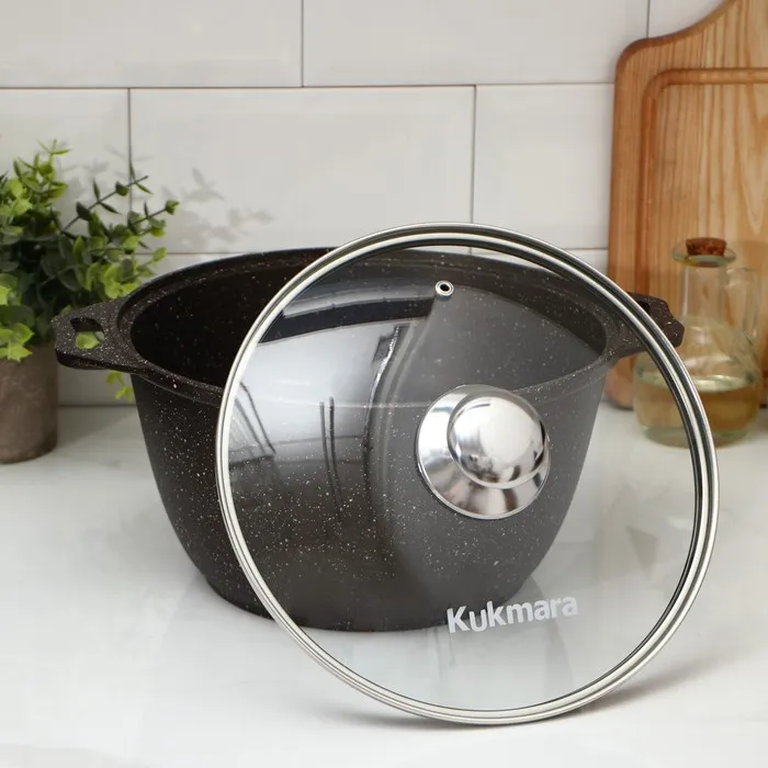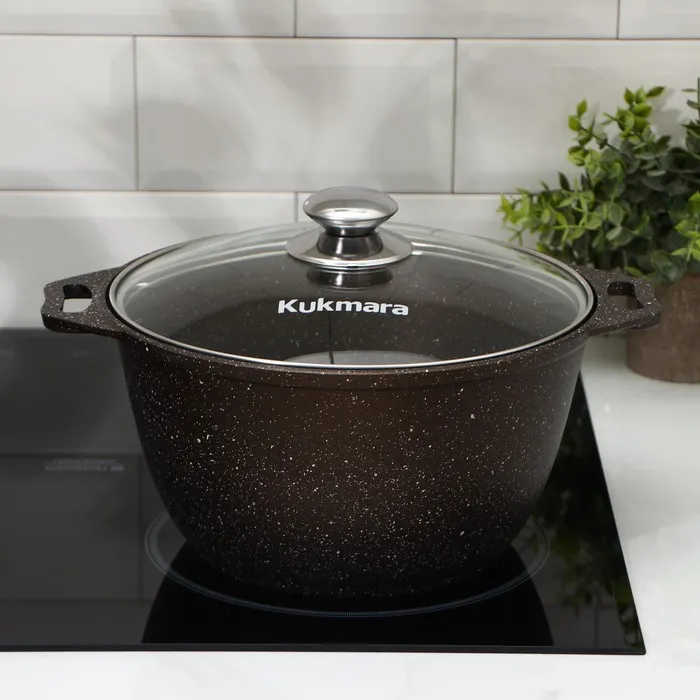 Кастрюля Kukmara сделана из литого алюминия. Имеет инновационное антипригарное мраморное покрытие на водной основе, которое изготовлено по немецкой технологии (Weilburger Coatings GmbH) и усилено сверхтвёрдыми частицами минералов.