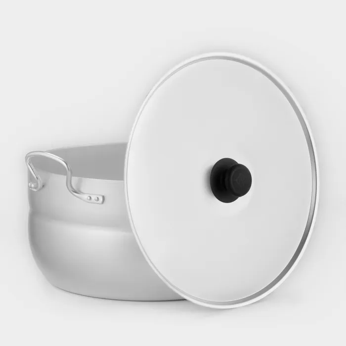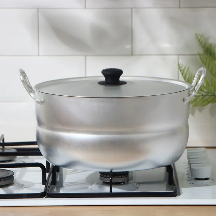 Кастрюля с металлической крышкой и двумя металлическими ручками на 8 литров изготовлена из чистого пищевого алюминия методом штамповки. Основные характеристики такой посуды: легкость, прочность, быстрый нагрев, безопасность и доступность. Кастрюля подходит к использованию на электрической, керамической, газовой плите, легко моется и имеет неограниченный срок службы.