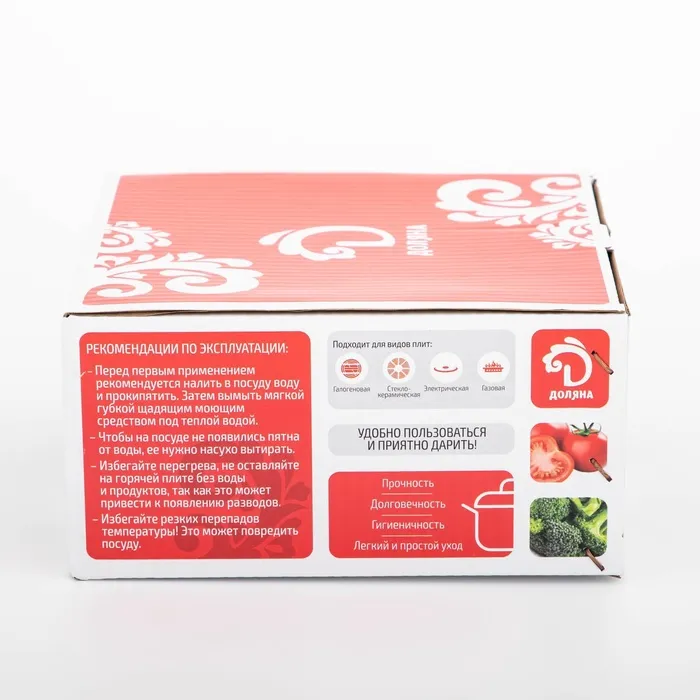 Кастрюля из нержавеющей стали «Доляна Роскошь» — идеальный выбор для вашей кухни! Трёхслойное капсулированное дно обеспечивает оптимальное распределение тепла и предотвращает пригорание пищи. Изготовлена из высококачественной нержавеющей стали, устойчивой к коррозии и долговечной. Имеет термостойкую стеклянную крышку и удобные ручки из нержавеющей стали. Подходит для всех типов плит и может быть использована в посудомоечной машине.