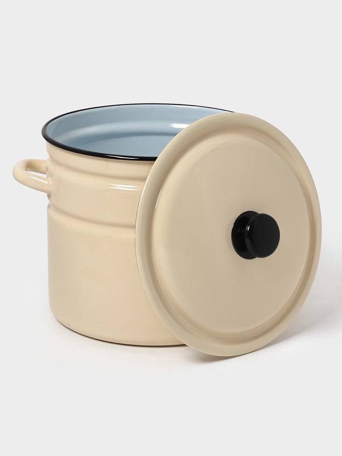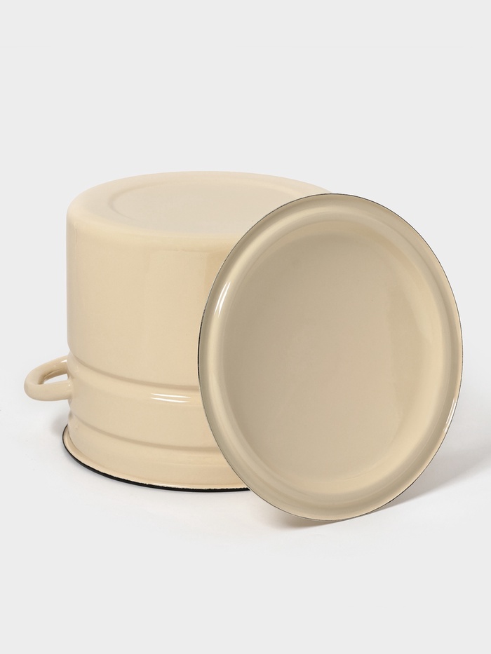 Цвет слоновой кости, гладкая поверхность без рисунка и крышка из той же эмалированной стали делают её практичной в использовании и простой в уходе.