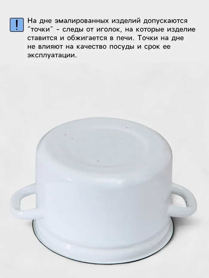 Примечание: На дне эмалированных изделий допускаются «точки» - следы от иголок, на которые изделие ставится и обжигается в печи. Точки на дне не влияют на качество посуды и срок её эксплуатации и соответствуют ГОСТ 24788-2018
