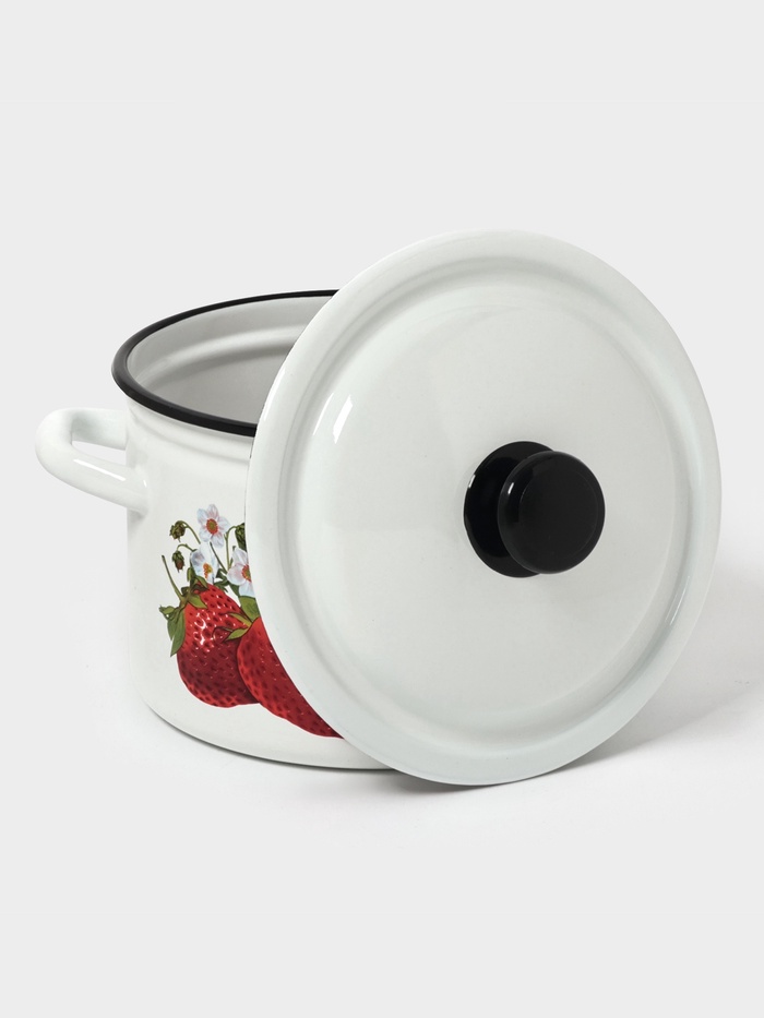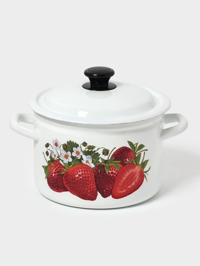 - Белая эмаль с рисунком: светлый фон помогает контролировать процесс варки и визуально увеличивает объём. Неброский декор добавляет уют, не нарушая гладкости поверхности — грязь не скапливается в углублениях.