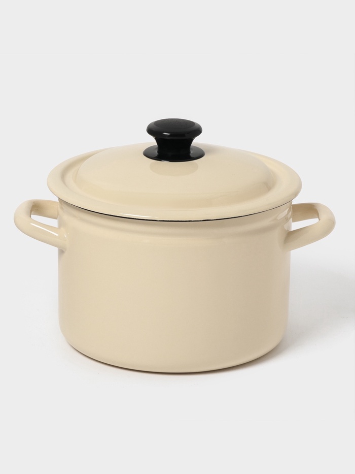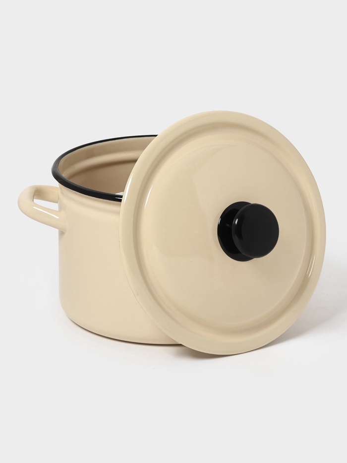 Цвет слоновой кости, гладкая поверхность без рисунка и крышка из той же эмалированной стали делают её практичной, лёгкой в уходе и неприхотливой в хранении.