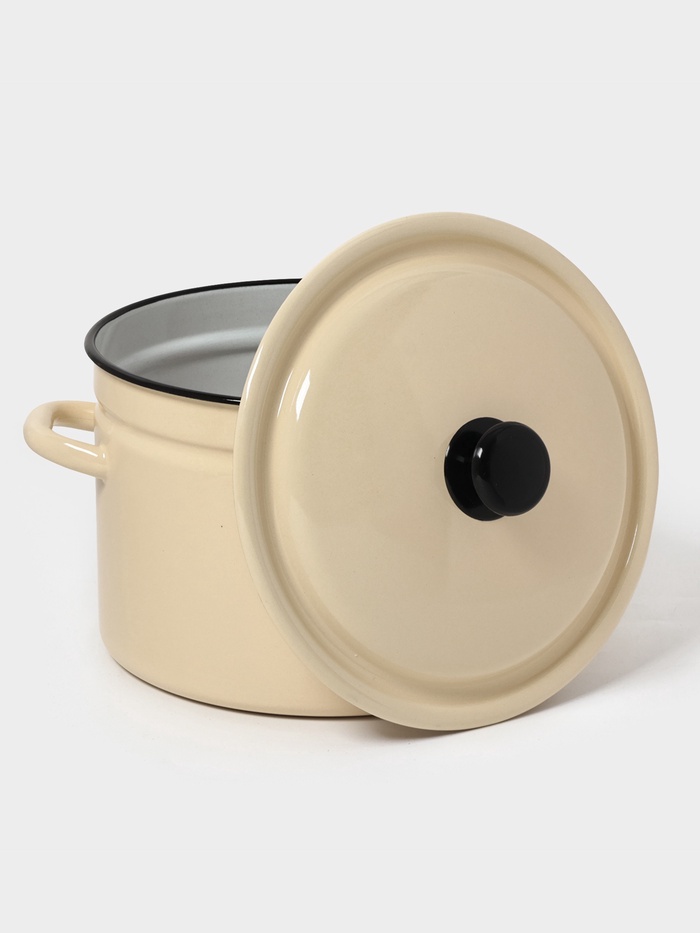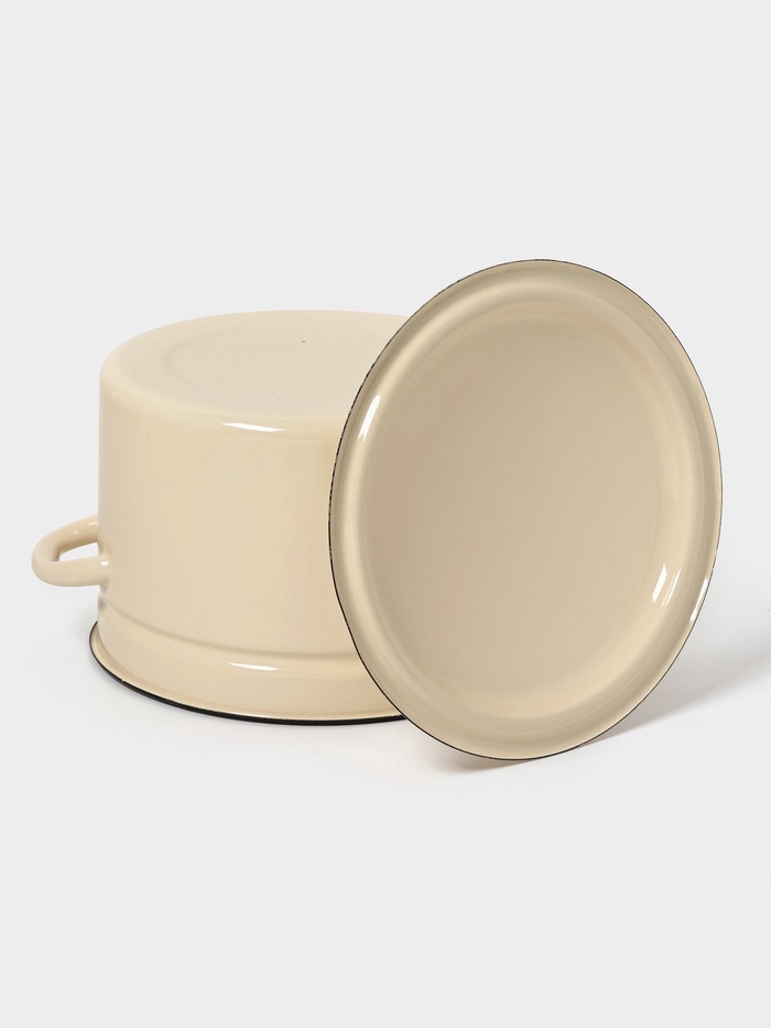Цвет слоновой кости, гладкая поверхность без рисунка и крышка из той же эмалированной стали делают её практичной в использовании и простой в уходе.
