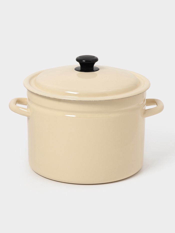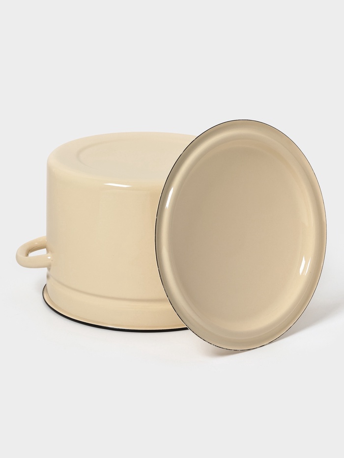 Цвет слоновой кости, гладкая поверхность без рисунка и крышка из той же эмалированной стали делают её практичной в использовании и простой в уходе.