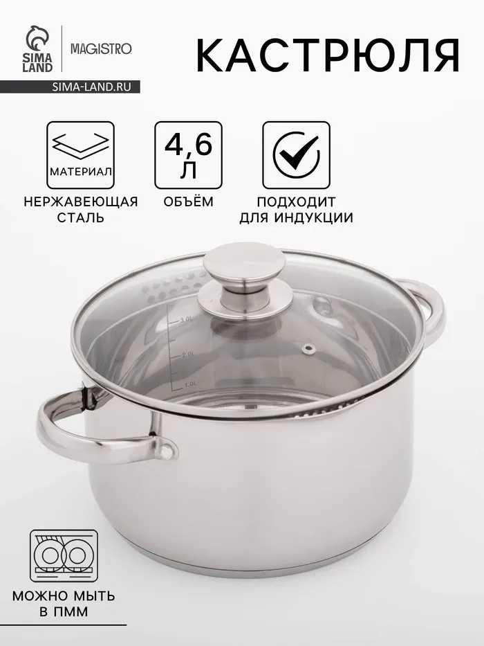 Кастрюля Magistro Grande из нержавеющей стали — в комплекте идёт стеклянная крышка с пароотводом для удобного контроля над процессом готовки. Капсульное дно равномерно распределяет тепло и ускоряет процесс приготовления пищи. Благодаря нержавеющей стали высокого качества, кастрюля долговечна и устойчива к коррозии. Она подходит для всех типов плит, включая индукционные, газовые, электрические и стеклокерамические.