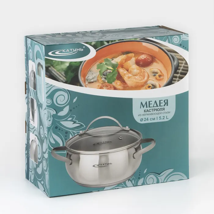 Кастрюля из нержавеющей стали «Медея», 5,2 л, d=24 см, капсульное дно, индукция подходит для всех видов плит. Сферический корпус, демонстрирующий зеркальную наружную полировку, вкупе с термостойкой стеклянной крышкой G-типа и прикрепленными методом точечной сварки прутковыми ручками создают привлекательный образ. Такая модель, без сомнения, украсит кухонный интерьер любого стиля. Толщина стенок изделия равняется 0,5 мм. Многослойное дно включает алюминиевую пластину, за счет которой теплораспределение происходит более интенсивно и равномерно.