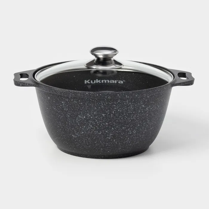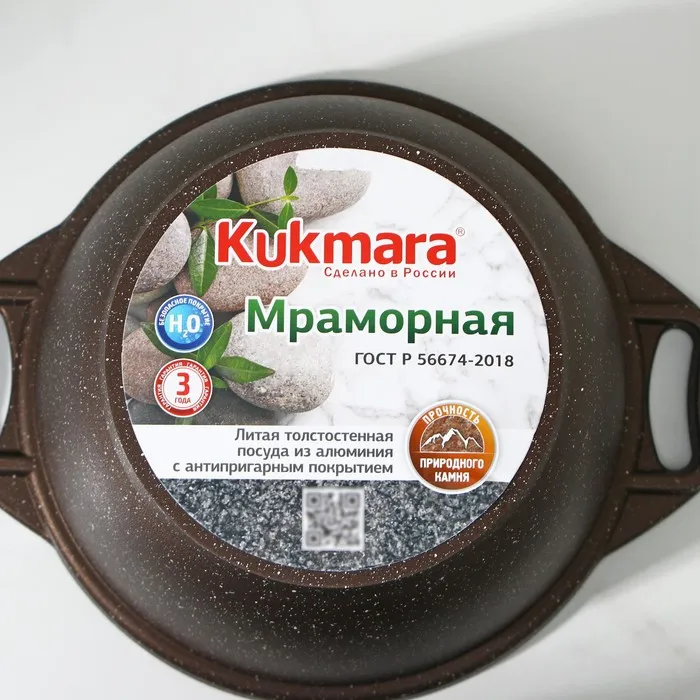Кастрюля Kukmara сделана из литого алюминия. Имеет инновационное антипригарное мраморное покрытие на водной основе, которое изготовлено по немецкой технологии (Weilburger Coatings GmbH) и усилено сверхтвёрдыми частицами минералов.