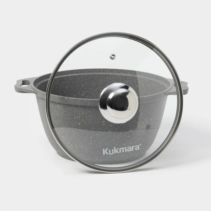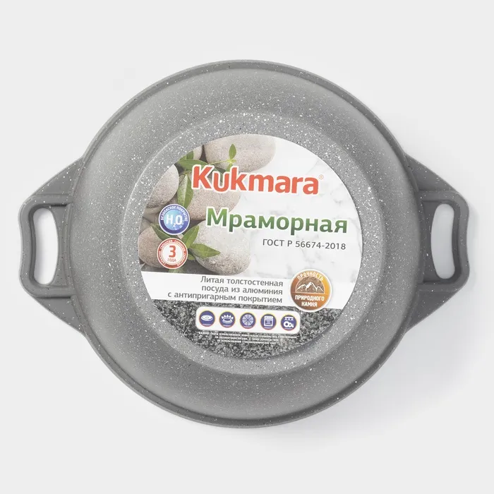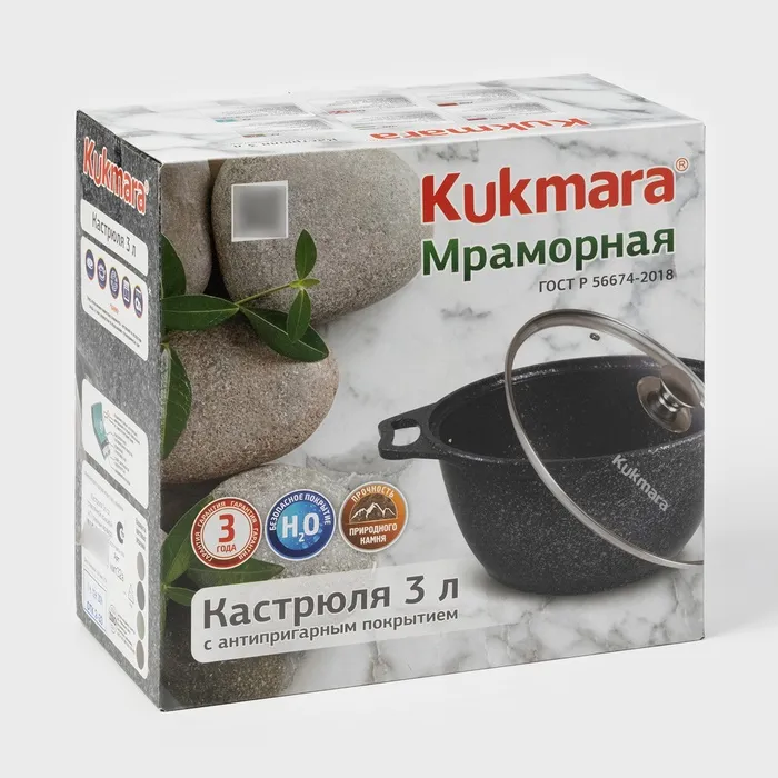 Кастрюля Kukmara сделана из литого алюминия. Имеет инновационное антипригарное мраморное покрытие на водной основе, которое изготовлено по немецкой технологии (Weilburger Coatings GmbH) и усилено сверхтвёрдыми частицами минералов.