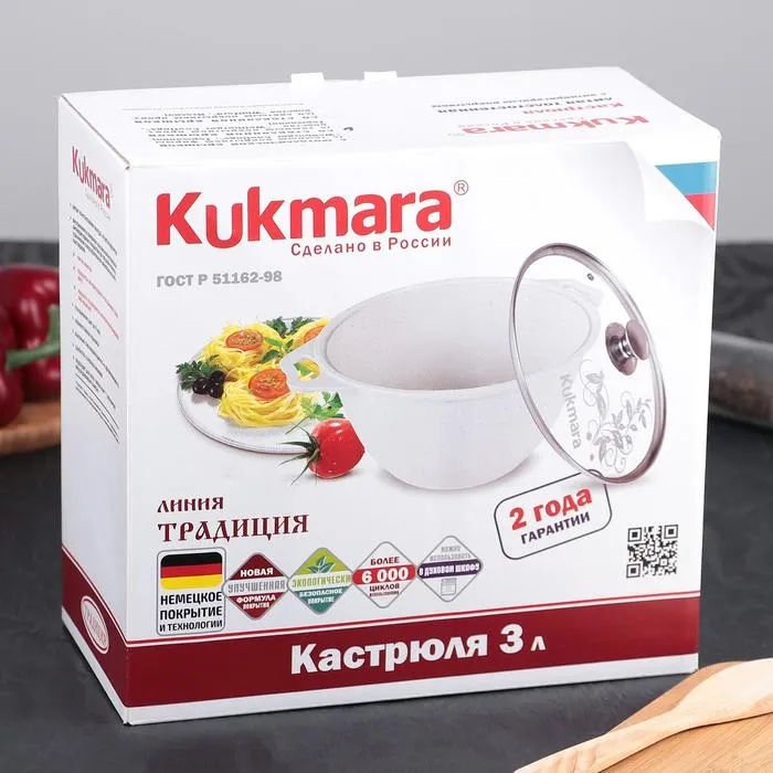 Продукция Kukmara изготовлена из литого алюминия и покрыта немецким высококачественным антипригарным покрытием на водной основе, усиленным сверхпрочными минеральными частицами.