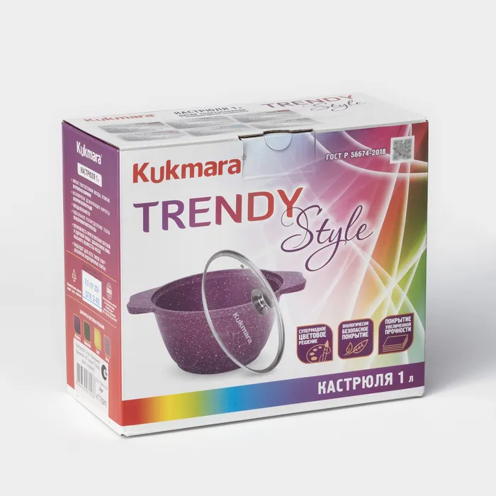 Посуда линии Trendy style разработана в соответствии с последними модными тенденциям. Кастрюля Kukmara сделана из литого алюминия, с внутренней и внешней стороны — антипригарное покрытие увеличенной прочности, изготовлено на водной основе по немецким технологиям.