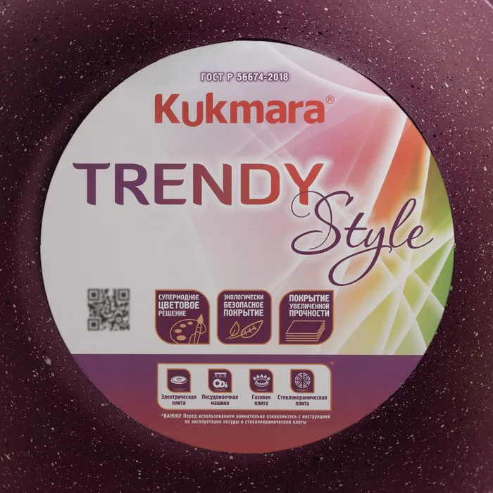 Посуда линии Trendy style разработана в соответствии с последними модными тенденциям. Кастрюля Kukmara сделана из литого алюминия, с внутренней и внешней стороны — антипригарное покрытие увеличенной прочности, изготовлено на водной основе по немецким технологиям.
