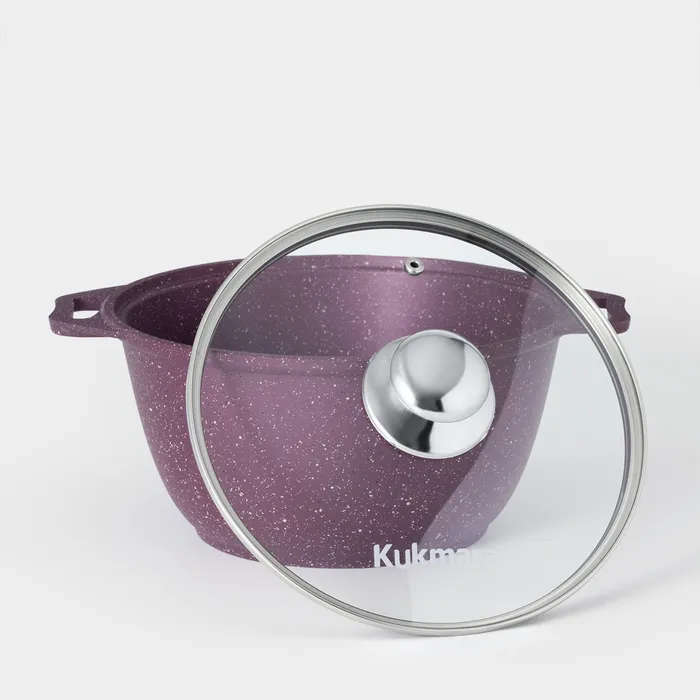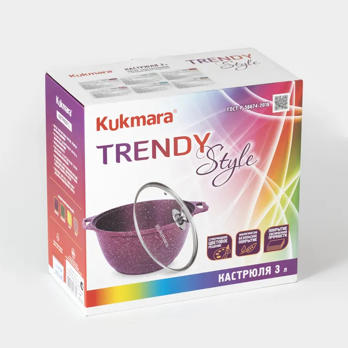 Кастрюля KUKMARA Trendy style, 3 л, d=22 см, h=13.5 см, антипригарное покрытие, стеклянная крышка, литой алюминий, фиолетовая — Характеристики