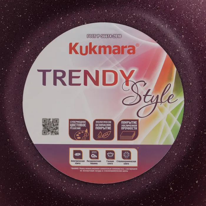 Посуда линии Trendy style разработана в соответствии с последними модными тенденциям. Кастрюля Kukmara сделана из литого алюминия, с внутренней и внешней стороны — антипригарное покрытие увеличенной прочности, изготовлено на водной основе по немецким технологиям.