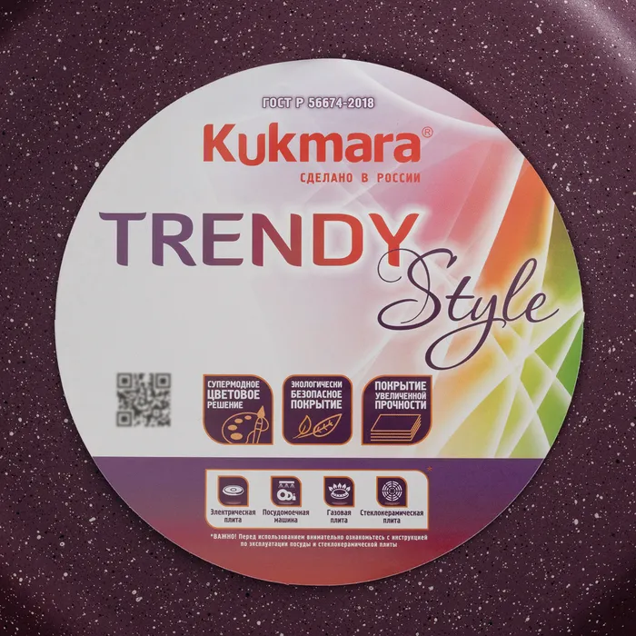 Посуда линии Trendy style разработана в соответствии с последними модными тенденциям. Кастрюля-жаровня Kukmara сделана из литого алюминия. С внутренней и внешней стороны имеет антипригарное покрытие повышенной прочности на водной основе, которое изготовлено по немецким технологиям (Weilburger Coatings GmbH).