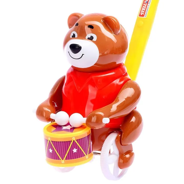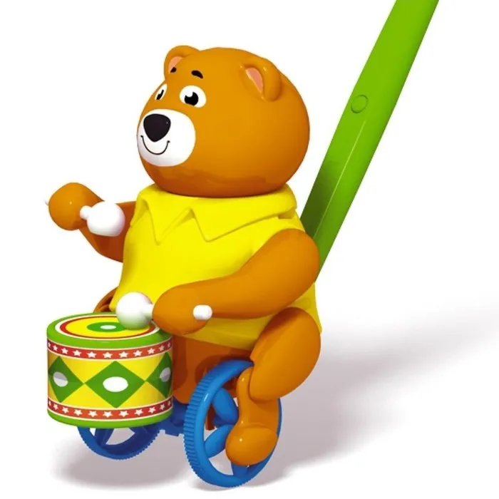 Дети будут с удовольствием бегать, держась за ручку каталки. Чем быстрее бегает малыш, тем активнее мишка будет настукивать свои ритмы и сучить толстыми ножками. Это забавное действие не только развлекает, но и развивает моторику и цветовое восприятие.