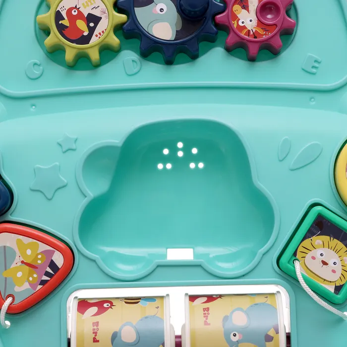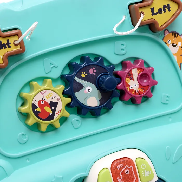 Встроенная панель с подвижными элементами и сортером надолго увлечёт малыша. Ребёнок сможет крутить шестерёнки, изучать формы и цвета, слушать приятные мелодии. Благодаря звуковым и световым эффектам каждое движение станет весёлым открытием.
