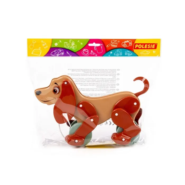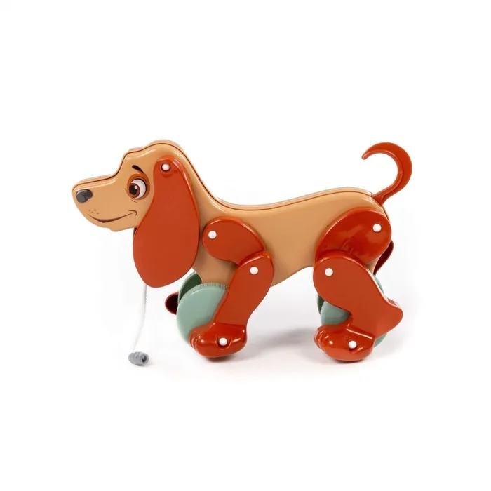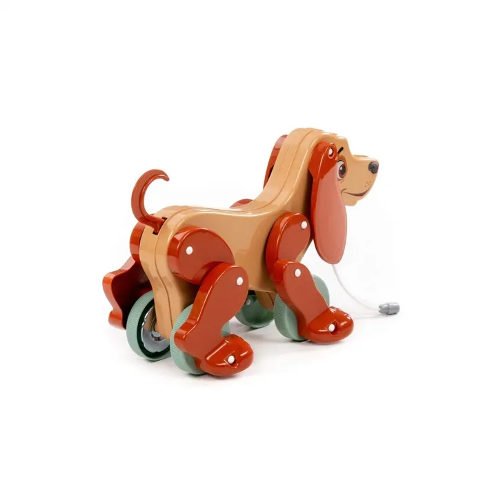 - Колёсики каталки вращаются, приводя в движение лапки собачки. Это создаёт эффект живой игрушки, которая весело семенит за малышом. Ребёнок с удовольствием будет тянуть её за собой, наблюдая за движением.