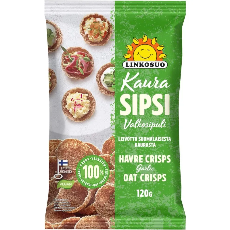 Хрустящие овсяные чипсы Linkosuo с чесноком – это идеальное финское лакомство. Наслаждайтесь прямо из упаковки или добавляйте свои любимые начинки. Изготовлены из 100% финского овса, они богаты клетчаткой, что делает их полезным перекусом. Упаковка весом 120 г позволит вам в полной мере насладиться этим уникальным вкусом.