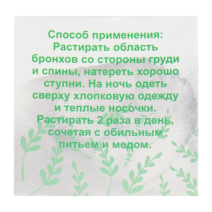 Рекомендации к применению: применять немедленно при обнаружении признаков заболевания теплым (горячим) растиранием спины и груди в области бронхов 2 раза в сутки, растирать ступни и укутывать теплым компрессом. При отсутствии температуры сочетается с применением разогревающих компрессов и горчичников. Применять до выздоровления.