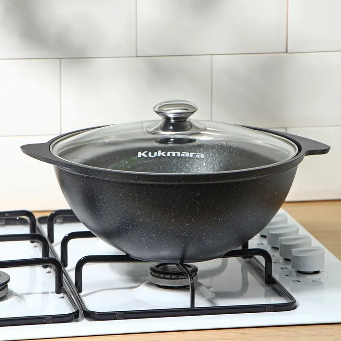 Посуда Kukmara «Мраморная» изготовлена из литого алюминия и покрыта инновационным антипригарным мраморным покрытием на водной основе, усиленным сверхтвёрдыми частицами минералов.