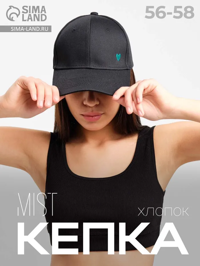 Кепка женская MIST с вышивкой сердце, размер 56-58, чёрная, хлопок 100% — Характеристики