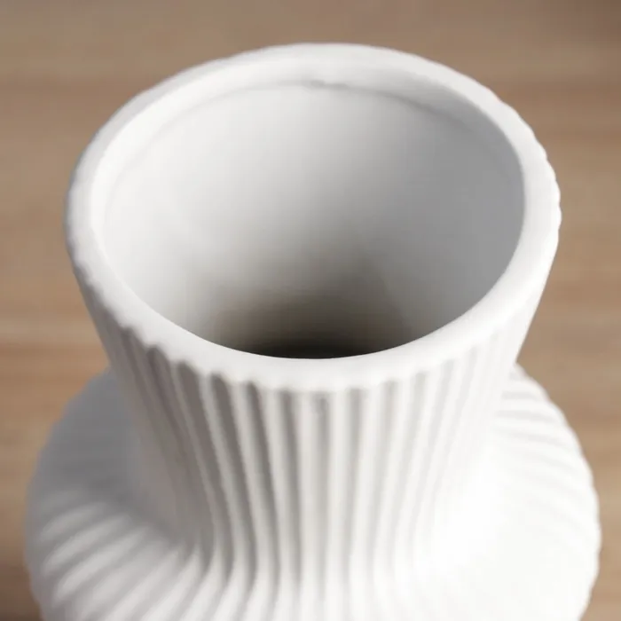 Почему стоит выбрать эту вазу? Она не только функциональна, но и эстетична. Это универсальный подарок для ценителей минимализма и современного дизайна. Простота формы и продуманный дизайн делают её незаменимым аксессуаром для тех, кто ценит детали. Добавьте в свой интерьер немного элегантности — выберите белую керамическую вазу с рельефным узором!