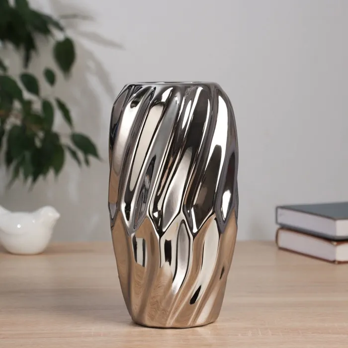 Стильный акцент для вашего интерьера! Серебристая керамическая ваза с рельефным узором – это универсальный декор, который добавит изысканности вашему пространству. Её лаконичный дизайн и компактные размеры делают её идеальным выбором для современного дома или офиса.