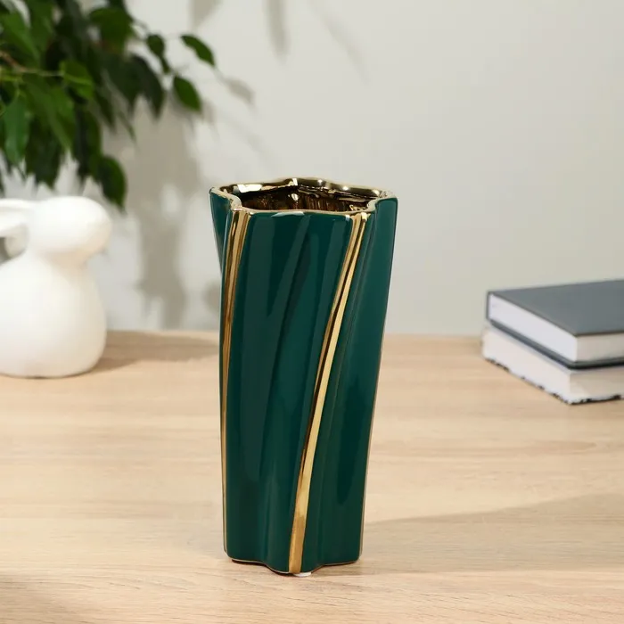 Керамическая ваза для цветов, сухоцветов «Остин», настольная, d-10 см, h-20 см, зелёно-золотой — Характеристики
