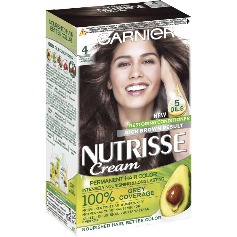 Garnier Nutrisse Cream – стойкая краска, которая придаст вашим волосам красивый, блестящий и длительный цвет. Она обеспечивает полное покрытие седины и придает волосам естественный вид. В комплекте идет кондиционер с маслами авокадо, оливы, карите и клюквы, которые закрывают кутикулы и сохраняют цвет внутри волоса. Кондиционер также питает, укрепляет и защищает волосы от ломкости. Волосы становятся мягкими и ухоженными. Продукт не предназначен для лиц младше 16 лет.