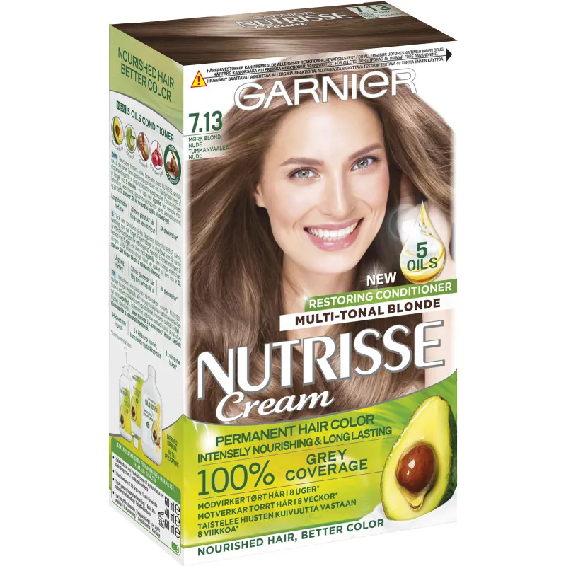 Garnier Nutrisse Cream — это перманентная краска, которая подарит вашим волосам красивый, блестящий и стойкий оттенок! Роскошные нюдовые оттенки содержат комбинацию трех разных нюансов: пепельного, золотого и перламутрового. Вы получите плотный цвет волос и естественный вид. Кондиционер в упаковке содержит масла авокадо, оливы, ши и клюквы, которые закрывают волосяные волокна и запирают цвет внутри волоса. Одновременно кондиционер питает, укрепляет и надежно защищает волосы от ломкости. Garnier Nutrisse Cream также закрашивает седину на 100%. Волосы становятся мягкими и ухоженными! Продукт не предназначен для лиц младше 16 лет.