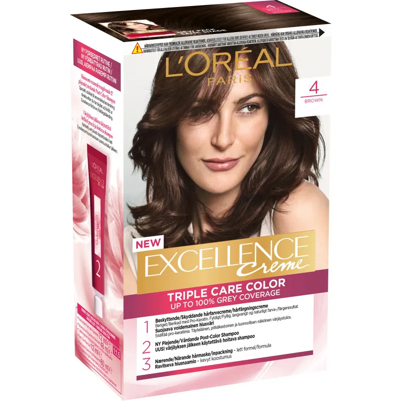 L'Oréal Paris Excellence Creme 4 Brown - это стойкая темно-коричневая краска для волос, содержащая Pro-Keratine, которая защищает и укрепляет окрашенные волосы. Трехэтапная формула Triple Care включает в себя ухаживающие ингредиенты, благодаря которым ваши волосы становятся шелковисто-гладкими. Обеспечивает насыщенный цвет, который долго сохраняется. Краска полностью закрашивает седые волосы.