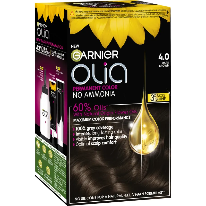 Garnier Olia 4.0 Темно-коричневая стойкая краска подарит вашим волосам красивый и длительный коричневый оттенок, который выглядит естественно. Формула улучшает качество волос и эффективно закрашивает седину. В отличие от традиционных красок для волос, Olia содержит 60% масляной смеси, делая волосы бархатисто мягкими. Не содержит аммиак.