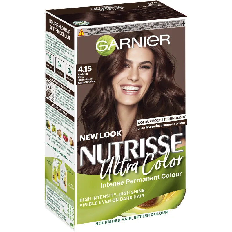 Garnier Nutrisse Ultra Color стойкая краска придаёт вашим волосам красивый, блестящий и долгосрочный оттенок! Вы получите насыщенный цвет и естественный вид волос. Кондиционер, входящий в комплект, содержит масла авокадо, оливы, карите и клюквы, которые закрывают волокна волос и запечатывают цвет внутри. Этот кондиционер также питает, укрепляет и эффективно защищает волосы от ломкости. Garnier Nutrisse Ultra Color покрывает седые волосы до 100%. Волосы становятся мягкими и ухоженными! Продукт не предназначен для лиц младше 16 лет.