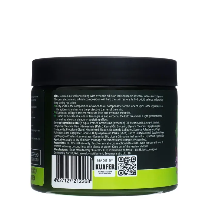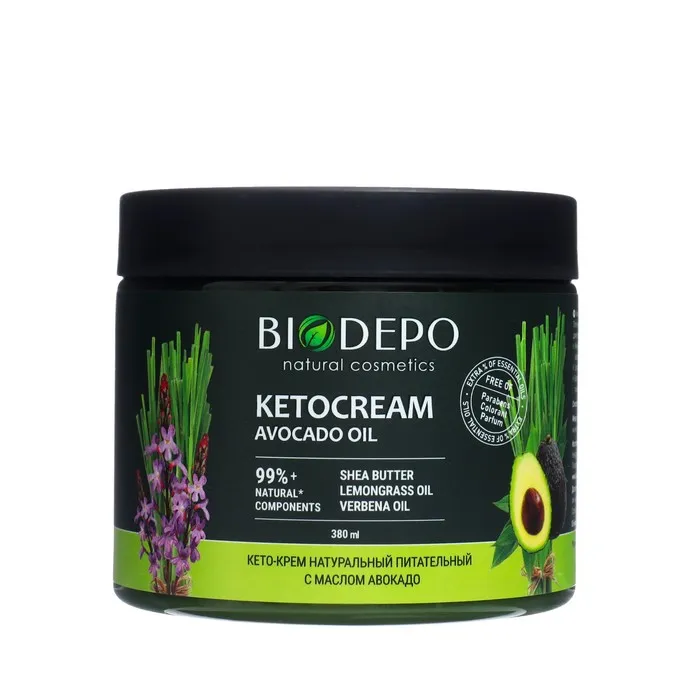 Натуральный питательный кето-крем с маслом авокадо - незаменимый помощник в уходе за телом. Плотная текстура и богатый маслами состав помогут коже восстановить гидро - липидный баланс и обеспечат длительное увлажнение. Жирные кислоты в составе масла авокадо восполняют недостаток липидов в верхних слоях эпидермиса и обеспечивают восстановление защитного барьера кожи. Эластин и коллаген препятствуют потере влаги и выравнивают рельеф. Благодаря эфирным маслам лемонграсса и вербены кето-крем имеет легкий приятный аромат, а так же тонизирующий и себорегулирующий эффект.